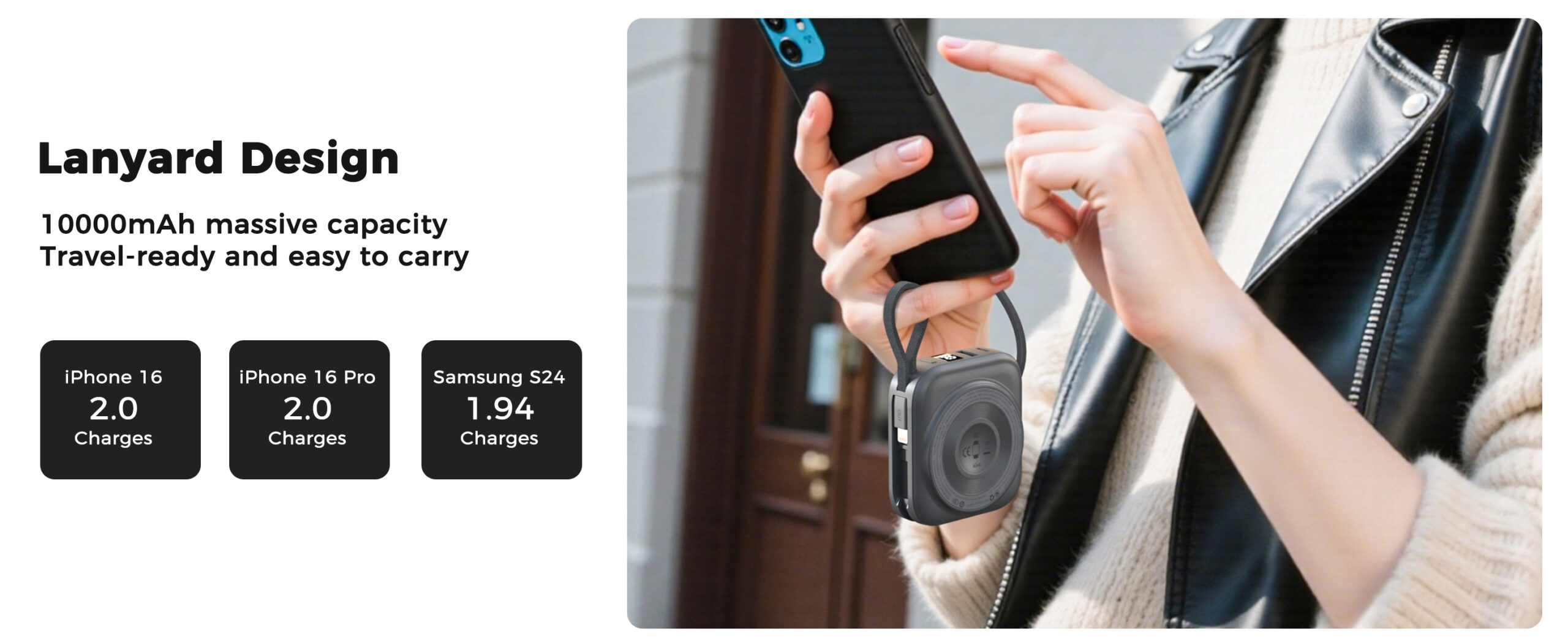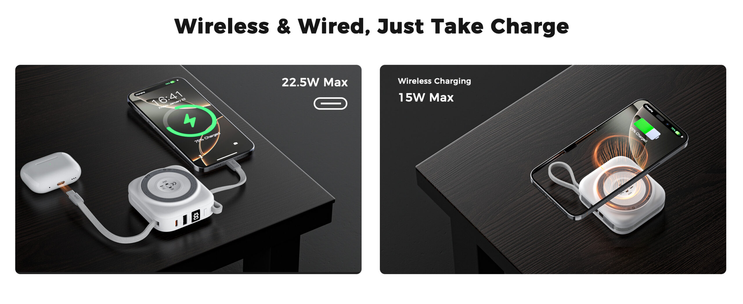 - 🔌 Built-in Dual Charging Cables: USB-C + Lightning, eliminating the need for extra cables; compatible with both Apple and Android devices.